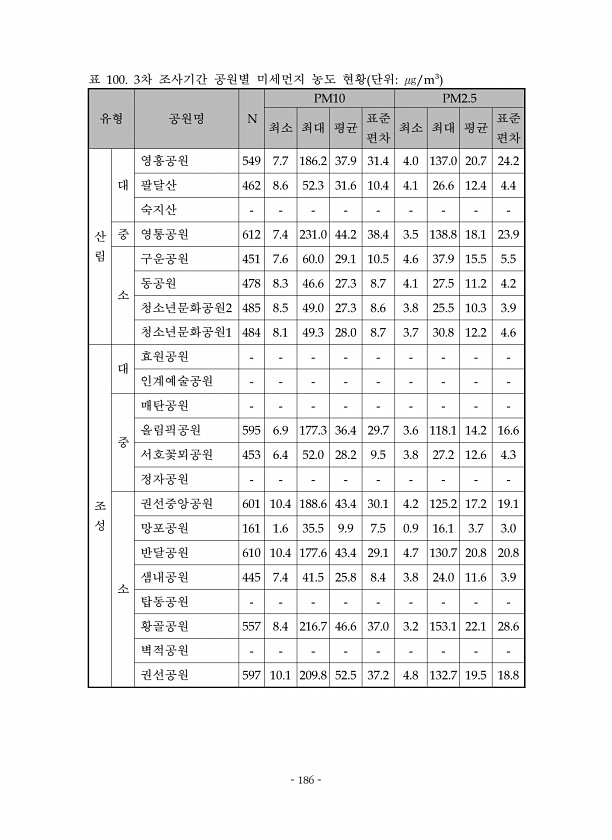 186 유형 공원명 최소 최대 평균 표준 편차 최소 최대 평균 표준 편차 산 림 대 영흥공원 팔달산 숙지산 중 영통공원 소 구운공원 동공원 청소년문화공원 청소년문화공원 조 성 대 효원공원 인계예술공원 중 매탄공원 올림픽공원 서호꽃뫼공원 정자공원 소 권선중앙공원 망포공원 반달공원 샘내공원 탑동공원 황골공원 벽적공원 권선공원 표 차 조사기간 공원별 미세먼지 농도 현황 단위 186