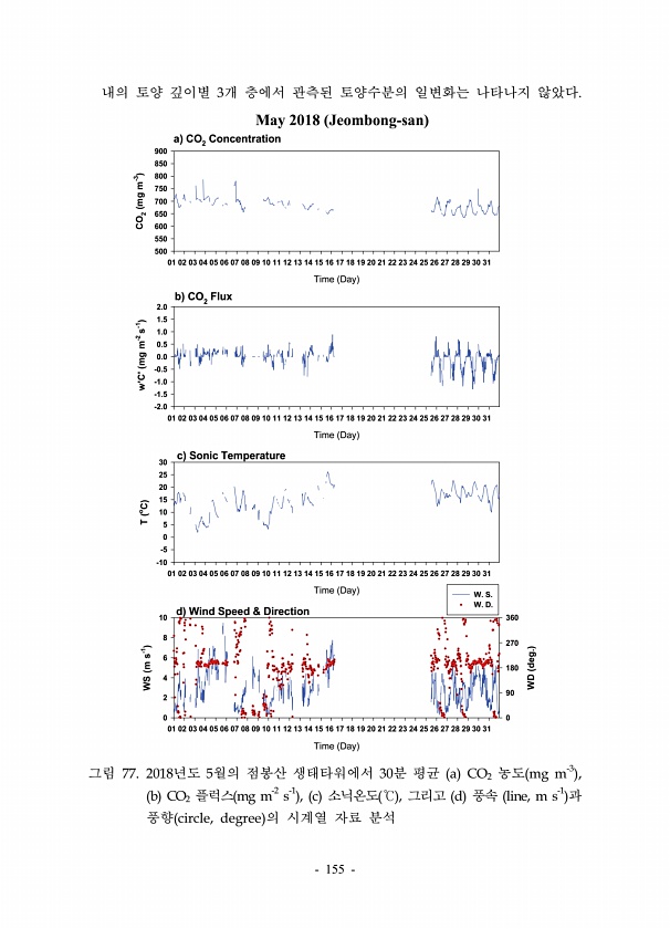155 내의 토양 깊이별 3개 층에서 관측된 토양수분의 일변화는 나타나지 않았다. a CO2 Concentration Time Day 01 02 03 04 05 06 07 08 09 10 11 12 13 14 15 16 17 18 19 20 21 22 23 24 25 26 27 28 29 30 31 CO 2 mg m-3 500 550 600 650 700 750 800 850 900 b CO2 Flux Time Day 01 02 03 04 05 06 07 08 09 10 11 12 13 14 15 16 17 18 19 20 21 22 23 24 25 26 27 28 29 30 31 wCmg m-2 s-1 -2.0 -1.5 -1.0 -0.5 0.0 0.5 1.0 1.5 2.0 c Sonic Temperatur...