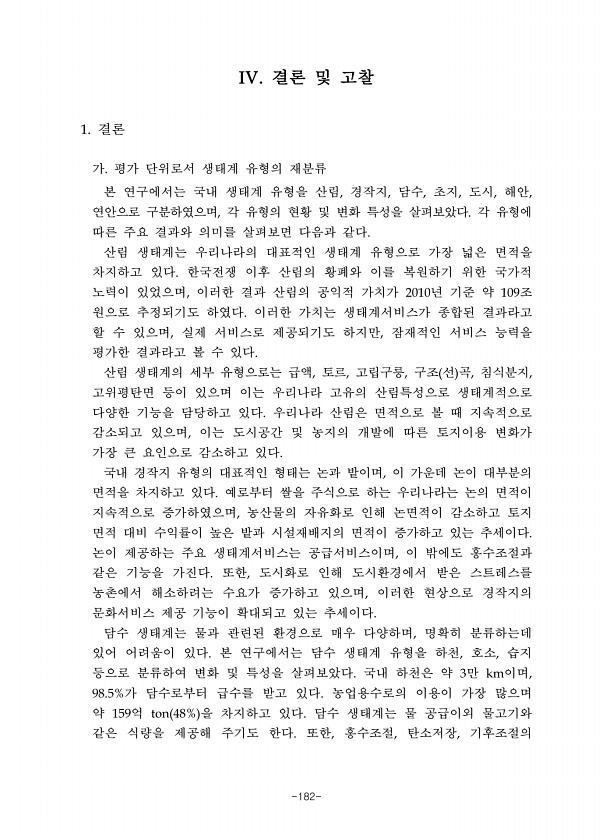-182- 결론 및 고찰 결론 가 평가 단위로서 생태계 유형의 재분류 본 연구에서는 국내 생태계 유형을 산림 경작지 담수 초지 도시 해안 연안으로 구분하였으며 각 유형의 현황 및 변화 특성을 살펴보았다 각 유형에 따른 주요 결과와 의미를 살펴보면 다음과 같다 산림 생태계는 우리나라의 대표적인 생태계 유형으로 가장 넓은 면적을 차지하고 있다 한국전쟁 이후 산림의 황폐와 이를 복원하기 위한 국가적 노력이 있었으며 이러한 결과 산림의 공익적 가치가 년 기준 약 조 원으로 추정되기도 하였다 이러한 가치는 생태계서비스가 종합된 결과라고 할 수 있으며 실제 서비스로 제공되기도 하지만 잠재적인 서비스 능력을 평가한 결과라고 볼 수 있다 산림 생태계의 세부 유형으로는 급액 토르 고립구릉 구조 선 곡 침식분지 고위평탄면 등...