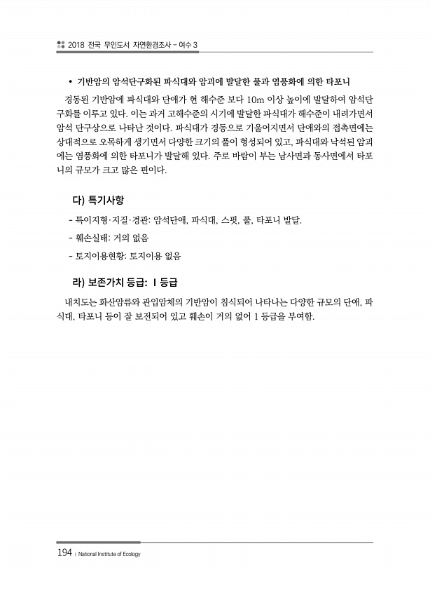 2018 전국 무인도서 자연환경조사 여수 3 194 ? National Institute of Ecology ? 기반암의 암석단구화된 파식대와 암괴에 발달한 풀과 염풍화에 의한 타포니 경동된 기반암에 파식대와 단애가 현 해수준 보다 10m 이상 높이에 발달하여 암석단 구화를 이루고 있다. 이는 과거 고해수준의 시기에 발달한 파식대가 해수준이 내려가면서 암석 단구상으로 나타난 것이다. 파식대가 경동으로 기울어지면서 단애와의 접촉면에는 상대적으로 오목하게 생기면서 다양한 크기의 풀이 형성되어 있고, 파식대와 낙석된 암괴 에는 염풍화에 의한 타포니가 발달해 있다. 주로 바람이 부는 남사면과 동사면에서 타포 니의 규모가 크고 많은 편이다. 특이지형·지질·경관암석단애, 파식대, 스핏, 풀, 타포니 발달. 훼손실태거의...