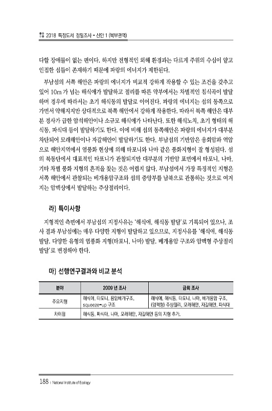 2018 특정도서 정밀조사 신안 1 북부권역 188 ? National Institute of Ecology 다할 장애물이 없는 편이다. 하지만 전형적인 외해 환경과는 다르게 주위의 수심이 얕고 인접한 섬들이 존재하기 때문에 파랑의 에너지가 제한된다. 부남섬의 서쪽 해안은 파랑의 에너지가 비교적 강하게 작용할 수 있는 조건을 갖추고 있어 10m 가 넘는 해식애가 발달하고 절리를 따른 약부에서는 차별적인 침식곡이 발달 하며 경우에 따라서는 초기 해식동의 발달로 이어진다. 파랑의 에너지는 섬의 동쪽으로 가면서 약해지지만 상대적으로 북쪽 해안에서 강하게 작용한다. 따라서 북쪽 해안은 대부 분 경사가 급한 암석해안이나 소규모 해식애가 나타난다. 또한 해식노치, 초기 형태의 해 식동, 파식대 등이 발달하기도 한다. ...