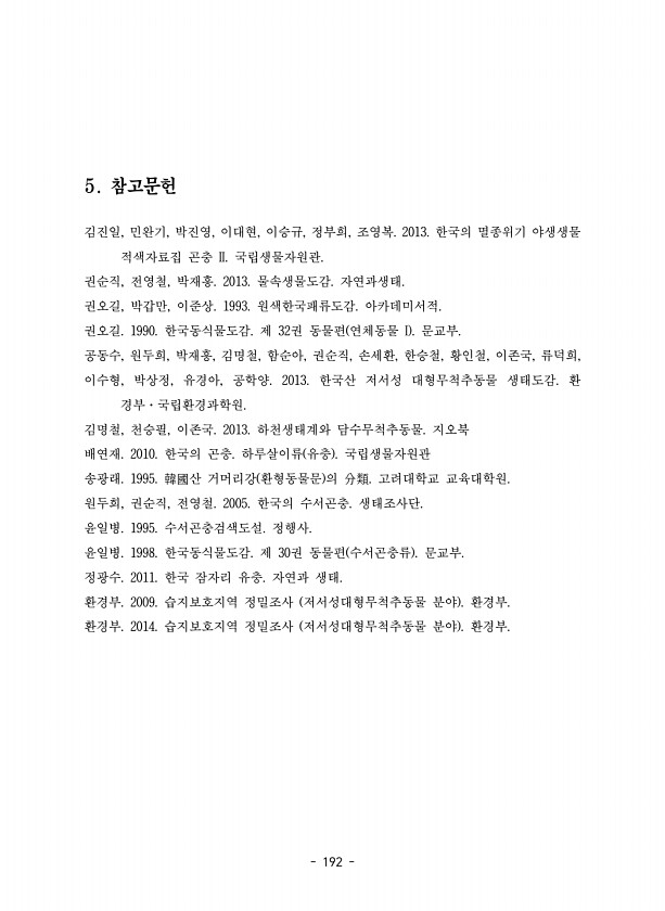 192 5. 참고문헌 김진일, 민완기, 박진영, 이대현, 이승규, 정부희, 조영복. 2013. 한국의 멸종위기 야생생물 적색자료집 곤충 II. 국립생물자원관. 권순직, 전영철, 박재흥. 2013. 물속생물도감. 자연과생태. 권오길, 박갑만, 이준상. 1993. 원색한국패류도감. 아카데미서적. 권오길. 1990. 한국동식물도감. 제 32권 동물편 연체동물 I 문교부. 공동수, 원두희, 박재흥, 김명철, 함순아, 권순직, 손세환, 한승철, 황인철, 이존국, 류덕희, 이수형, 박상정, 유경아, 공학양. 2013. 한국산 저서성 대형무척추동물 생태도감. 환 경부·국립환경과학원. 김명철, 천승필, 이존국. 2013. 하천생태계와 담수무척추동물. 지오북 배연재. 2010. 한국의 곤충. 하루살이류 유충 국립생물자원관 ...