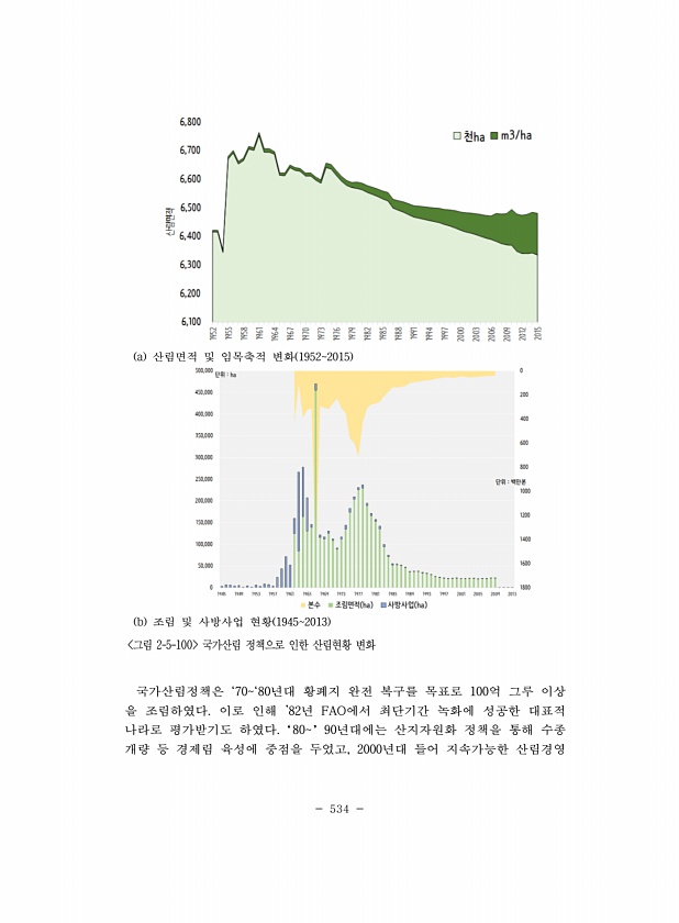 534 a 산림면적 및 임목축적 변화 19522015 b 조림 및 사방사업 현황 19452013 그림 2-5-100 국가산림 정책으로 인한 산림현황 변화 국가산림정책은 `70`80년대 황폐지 완전 복구를 목표로 100억 그루 이상 을 조림하였다. 이로 인해 82년 FAO에서 최단기간 녹화에 성공한 대표적 나라로 평가받기도 하였다.‘80’90년대에는 산지자원화 정책을 통해 수종 개량 등 경제림 육성에 중점을 두었고, 2000년대 들어 지속가능한산림경영