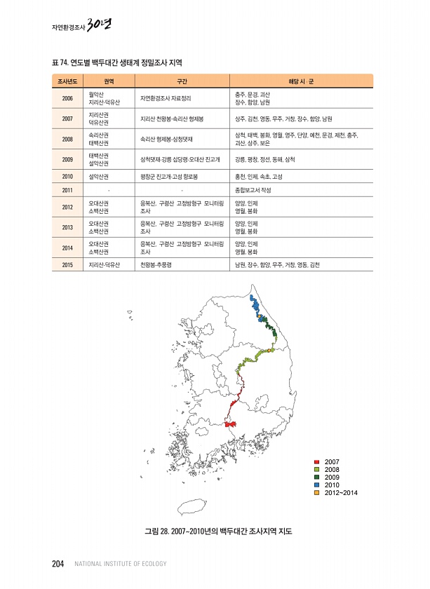 표 74. 연도별 백두대간 생태계 정밀조사 지역 조사년도 권역 구간 해당 시 · 군 2006 월악산 지리산-덕유산 자연환경조사 자료정리 충주 장수, , 문경 함양, , 괴산 남원 2007 지리산권 덕유산권 지리산 천왕봉-속리산 형제봉 상주, 김천, 영동, 무주, 거창, 장수, 함양, 남원 2008 속리산권 태백산권 속리산 형제봉-삼청댓재 삼척 괴산, , 태백 상주, , 봉화 보은, 영월, 영주, 단양, 예천, 문경, 제천, 충주, 2009 태백산권 설악산권 삼척댓재-강릉 삽당령-오대산 진고개 강릉, 평창, 정선, 동해, 삼척 2010 설악산권 평창군 진고개-고성 향로봉 홍천, 인제, 속초, 고성 2011 종합보고서 작성 2012 오대산권 소백산권 응복산, 구령산 고정방형구 모니터링 조사 양양, 인제 영월, ...