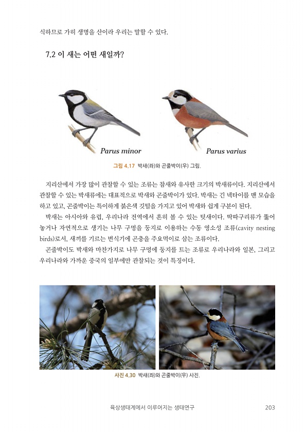 육상생태계에서 이루어지는 생태연구 203 식하므로 가히 생명을 산이라 우리는 말할 수 있다. 7.2 이 새는 어떤 새일까? 지리산에서 가장 많이 관찰할 수 있는 조류는 참새와 유사한 크기의 박새류이다. 지리산에서 관찰할 수 있는 박새류에는 대표적으로 박새와 곤줄박이가 있다. 박새는 긴 넥타이를 맨 모습을 하고 있고, 곤줄박이는 특이하게 붉은색 깃털을 가지고 있어 박새와 쉽게 구분이 된다. 박새는 아시아와 유럽, 우리나라 전역에서 흔히 볼 수 있는 텃새이다. 딱따구리류가 뚫어 놓거나 자연적으로 생기는 나무 구멍을 둥지로 이용하는 수동 영소성 조류 cavity nesting birds 로서, 새끼를 기르는 번식기에 곤충을 주요먹이로 삼는 조류이다. 곤줄박이도 박새와 마찬가지로 나무 구멍에 둥지를 트는 조류로 우...