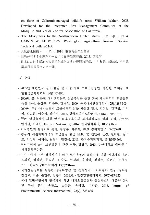 나 논문 년 대한민국 질소 유입 및 유출 수지 윤동민 박신형 박재우 대 한환경공학학회지 년 봄 여름철 대기오염물질 집중측정을 통한 도시 계곡지역의 오존농도 특성 분석 송상근 김유근 강재은 한국대기환경학회지 년 우리나라 농경지 토양에서의 배출량 평가 정현철 김건엽 이덕 배 심교문 이슬비 강기경 한국토양비료학회지 연대측정에 의한 일본 타호부호수의 토사퇴적속도 변화 분석 안영상 안기완 이계한 한국임학회지 가로림만의 환경가치 평가 유승훈 이주석 경제학연구 강우시 시절재배지역의 오염물질 유출 및 원단위 산정 전제찬 권구 호 이상협 이재윤 권현각 민경석 한국습지학회지 경남지역의 습지 보전방안에 관한 연구 정영주 부산대학교 대학원 석 사학위청구논문 경사지에서 고추 정식시기에 따른 토양유실과 유출수에 대한 식생피복 효과 ...