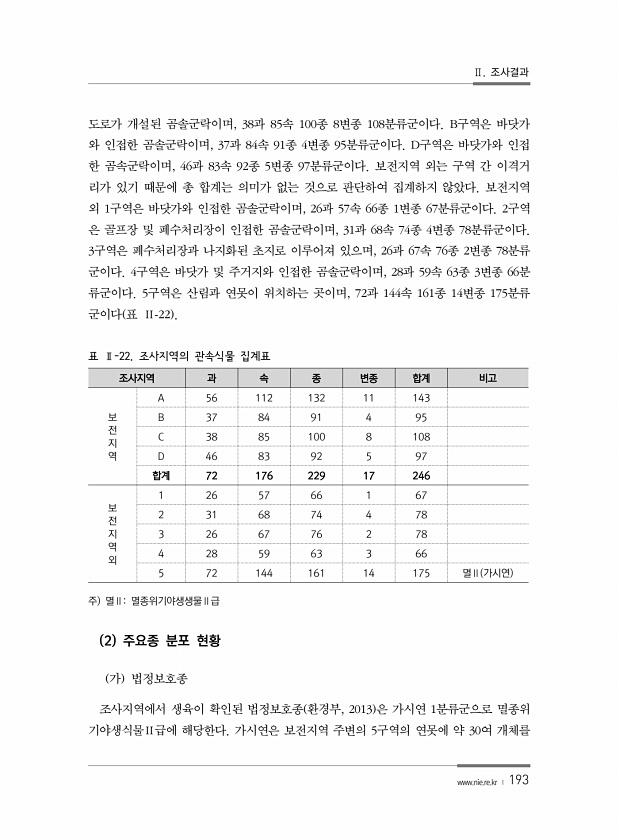 Ⅱ. 조사결과 www.nie.re.kr ? 193 도로가 개설된 곰솔군락이며, 38과 85속 100종 8변종 108분류군이다. B구역은 바닷가 와 인접한 곰솔군락이며, 37과 84속 91종 4변종 95분류군이다. D구역은 바닷가와 인접 한 곰속군락이며, 46과 83속 92종 5변종 97분류군이다. 보전지역 외는 구역 간 이격거 리가 있기 때문에 총 합계는 의미가 없는 것으로 판단하여 집계하지 않았다. 보전지역 외 1구역은 바닷가와 인접한 곰솔군락이며, 26과 57속 66종 1변종 67분류군이다. 2구역 은 골프장 및 폐수처리장이 인접한 곰솔군락이며, 31과 68속 74종 4변종 78분류군이다. 3구역은 폐수처리장과 나지화된 초지로 이루어져 있으며, 26과 67속 76종 2변종 78분류 군이다. 4구역은 바닷...