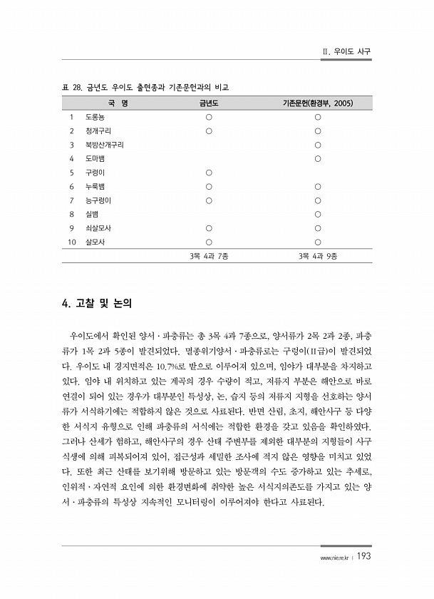 Ⅱ. 우이도 사구 www.nie.re.kr ? 193 표 28. 금년도 우이도 출현종과 기존문헌과의 비교 국 명 금년도 기존문헌 환경부, 2005 1 도롱뇽 ○ ○ 2 청개구리 ○ ○ 3 북방산개구리 ○ 4 도마뱀 ○ 5 구렁이 ○ 6 누룩뱀 ○ ○ 7 능구렁이 ○ ○ 8 실뱀 ○ 9 쇠살모사 ○ ○ 10 살모사 ○ ○ 3목 4과 7종 3목 4과 9종 4. 고찰 및 논의 우이도에서 확인된 양서·파충류는 총 3목 4과 7종으로, 양서류가 2목 2과 2종, 파충 류가 1목 2과 5종이 발견되었다. 멸종위기양서·파충류로는 구렁이 Ⅱ급 이 발견되었 다. 우이도 내 경지면적은 10.7%로 밭으로 이루어져 있으며, 임야가 대부분을 차지하고 있다. 임야 내 위치하고 있는 계곡의 경우 수량이 적고, 저류지 부분은 해안으로...
