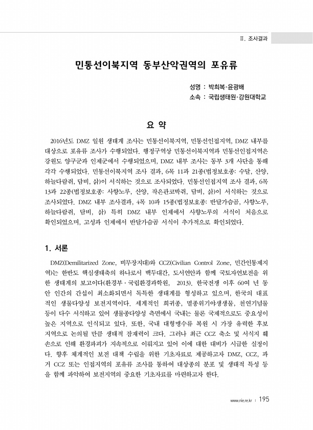 Ⅱ. 조사결과 www.nie.re.kr ? 195 민통선이북지역 동부산악권역의 포유류 성명 박희복·윤광배 소속 국립생태원·강원대학교 요 약 2016년도 DMZ 일원 생태계 조사는 민통선이북지역, 민통선인접지역, DMZ 내부를 대상으로 포유류 조사가 수행되었다. 행정구역상 민통선이북지역과 민통선인접지역은 강원도 양구군과 인제군에서 수행되었으며, DMZ 내부 조사는 동부 3개 사단을 통해 각각 수행되었다. 민통선이북지역 조사 결과, 6목 11과 21종 법정보호종수달, 산양, 하늘다람쥐, 담비, 삵 이 서식하는 것으로 조사되었다. 민통선인접지역 조사 결과, 6목 13과 22종 법정보호종사향노루, 산양, 작은관코박쥐, 담비, 삵 이 서식하는 것으로 조사되었다. DMZ 내부 조사결과, 4목 10과 15종 법정보호종반...