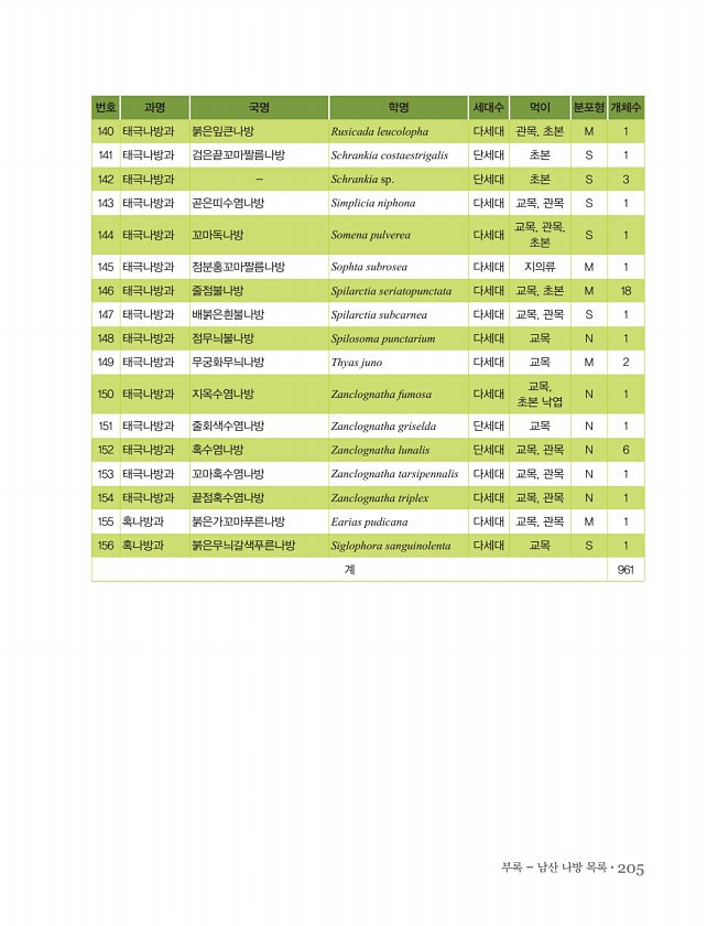 부록 남산 나방 목록?205 번호 과명 국명 학명 세대수 먹이 분포형 개체수 140 태극나방과 붉은잎큰나방 Rusicada leucolopha 다세대 관목, 초본 M 1 141 태극나방과 검은끝꼬마짤름나방 Schrankia costaestrigalis 단세대 초본 S 1 142 태극나방과 Schrankia sp. 단세대 초본 S 3 143 태극나방과 곧은띠수염나방 Simplicia niphona 다세대 교목, 관목 S 1 144 태극나방과 꼬마독나방 Somena pulverea 다세대 교목, 관목, 초본 S 1 145 태극나방과 점분홍꼬마짤름나방 Sophta subrosea 다세대 지의류 M 1 146 태극나방과 줄점불나방 Spilarctia seriatopunctata 다세대 교목, 초본 M 18 147 ...