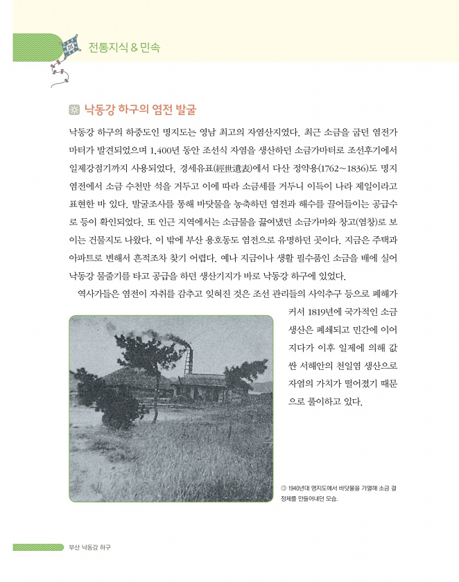 부산 낙동강 하구 낙동강 하구의 염전 발굴 낙동강 하구의 하중도인 명지도는 영남 최고의 자염산지였다. 최근 소금을 굽던 염전가 마터가 발견되었으며 1,400년 동안 조선식 자염을 생산하던 소금가마터로 조선후기에서 일제강점기까지 사용되었다. 경세유표 經世遺表 에서 다산 정약용 1762∼1836 도 명지 염전에서 소금 수천만 석을 거두고 이에 따라 소금세를 거두니 이득이 나라 제일이라고 표현한 바 있다. 발굴조사를 통해 바닷물을 농축하던 염전과 해수를 끌어들이는 공급수 로 등이 확인되었다. 또 인근 지역에서는 소금물을 끓여냈던 소금가마와 창고 염창 로 보 이는 건물지도 나왔다. 이 밖에 부산 용호동도 염전으로 유명하던 곳이다. 지금은 주택과 아파트로 변해서 흔적조차 찾기 어렵다. 예나 지금이나 생활 필수품인 소...