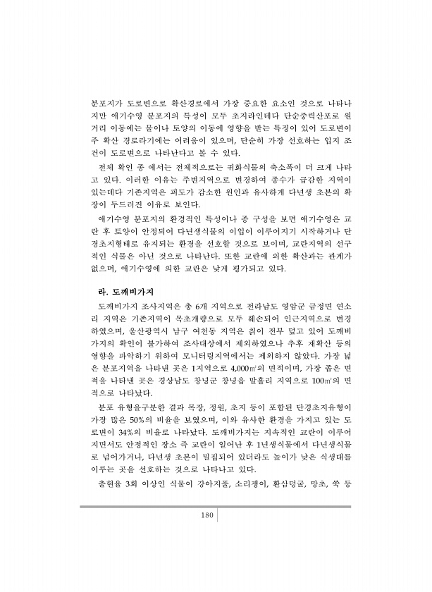 180 분포지가 도로변으로 확산경로에서 가장 중요한 요소인 것으로 나타나 지만 애기수영 분포지의 특성이 모두 초지라인데다 단순중력산포로 원 거리 이동에는 물이나 토양의 이동에 영향을 받는 특징이 있어 도로변이 주 확산 경로라기에는 어려움이 있으며, 단순히 가장 선호하는 입지 조 건이 도로변으로 나타난다고 볼 수 있다. 전체 확인 종 에서는 전체적으로는 귀화식물의 축소폭이 더 크게 나타 고 있다. 이러한 이유는 주변지역으로 변경하여 종수가 급감한 지역이 있는데다 기존지역은 피도가 감소한 원인과 유사하게 다년생 초본의 확 장이 두드러진 이유로 보인다. 애기수영 분포지의 환경적인 특성이나 종 구성을 보면 애기수영은 교 란 후 토양이 안정되어 다년생식물의 이입이 이루어지기 시작하거나 단 경초지형태로 유지되는 환경을...