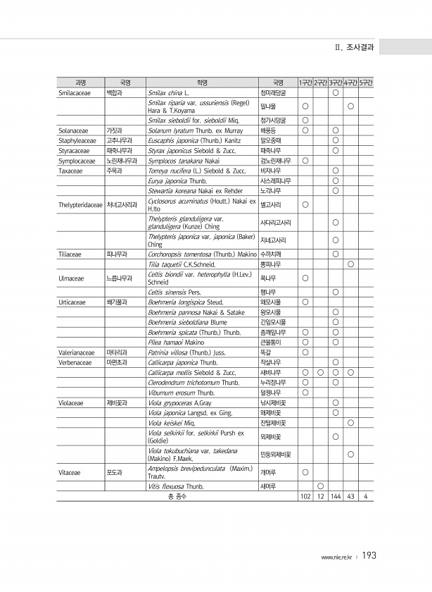 Ⅱ. 조사결과 www.nie.re.kr ? 193 과명 국명 학명 국명 1구간 2구간 3구간 4구간 5구간 Smilacaceae 백합과 Smilax china L. 청미래덩굴 ? Smilax riparia var. ussuriensis Regel Hara & T.Koyama 밀나물 ? ? Smilax sieboldii for. sieboldii Miq. 청가시덩굴 ? Solanaceae 가짓과 Solanum lyratum Thunb. ex Murray 배풍등 ? ? Staphyleaceae 고추나무과 Euscaphis japonica Thunb. Kanitz 말오줌때 ? Styracaceae 때죽나무과 Styrax japonicus Siebold & Zucc. 때죽나무 ? Symplocaceae 노린재나무과...