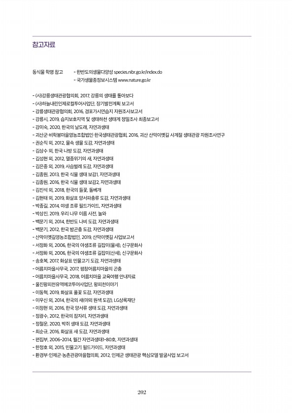 202 동식물 학명 참고 한반도의생물다양성 species.nibr.go.kr/index.do 국가생물종정보시스템 www.nature.go.kr 사 강릉생태관광협의회, 2017, 강릉의 생태를 톺아보다 사 하늘내린인제로컬투어사업단, 장기발전계획 보고서 강릉생태관광협의회, 2016, 경포가시연습지 자원조사보고서 강릉시, 2019, 습지보호지역 및 생태하천 생태계 정밀조사 최종보고서 강미숙, 2020, 한국의 날도래, 자연과생태 괴산군·비학봉마을영농조합법인·한국생태관광협회, 2016, 괴산 산막이옛길 사계절 생태관광 자원조사연구 권순직 외, 2012, 물속 생물 도감, 자연과생태 김상수 외, 한국 나방 도감, 자연과생태 김성현 외, 2012, 멸종위기의 새, 자연과생태 김은중 외, 2019, 사슴벌레 도감, 자연...