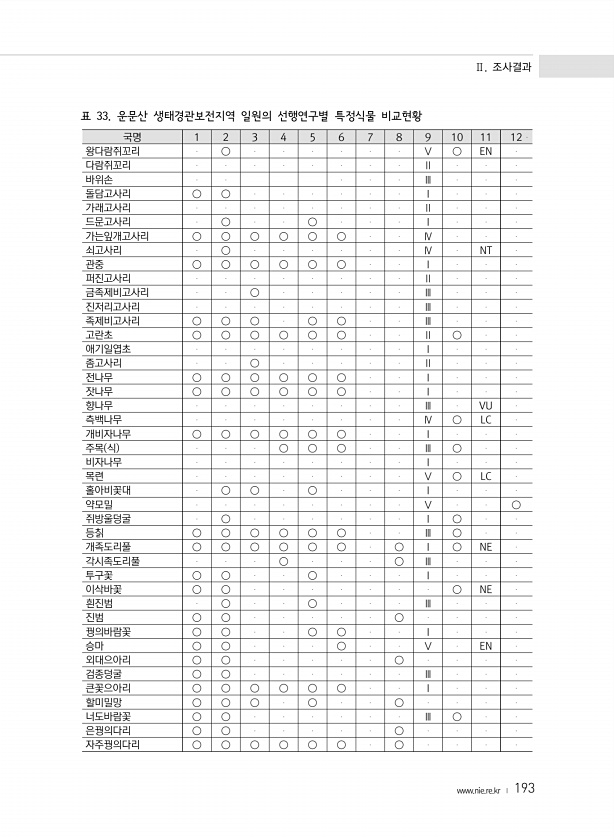 Ⅱ. 조사결과 www.nie.re.kr ? 193 국명 1 2 3 4 5 6 7 8 9 10 11 12 왕다람쥐꼬리 ○ Ⅴ ○ EN 다람쥐꼬리 Ⅱ 바위손 Ⅲ 돌담고사리 ○ ○ Ⅰ 가래고사리 Ⅱ 드문고사리 ○ ○ Ⅰ 가는잎개고사리 ○ ○ ○ ○ ○ ○ Ⅳ 쇠고사리 ○ Ⅳ NT 관중 ○ ○ ○ ○ ○ ○ Ⅰ 퍼진고사리 Ⅱ 금족제비고사리 ○ Ⅲ 진저리고사리 ...