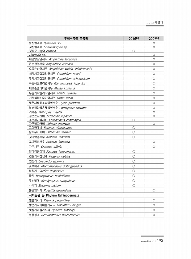 Ⅱ. 조사결과 www.nie.re.kr ? 193 무척추동물 종목록 2016년 2007년 뿔잔벌레류 Dynoides sp. ◇ 갯잔벌레류 Gnorismorpha sp. ◇ 갯강구 Ligia exotica ○ Limnoria sp. ◇ 태평양참옆새우 Amphithoe lacertosa ◇ 큰손참옆새우 Amphithoe koreana ◇ 오목손참옆새우 Amphithoe valida shimizuensis ◇ 세가시육질꼬리옆새우 Corophium uenoi ◇ 두가시육질꼬리옆새우 Corophium acherusicum ◇ 극동육질꼬리옆새우 Gammaropsis japonica ◇ 네모손멜리타옆새우 Melita koreana ◇ 두발가락멜리타옆새우 Melita rylovae ◇ 긴채찍해조숨이옆새우 Hyale rub...