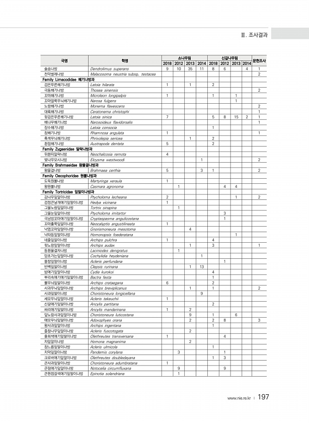 Ⅱ. 조사결과 www.nie.re.kr ? 197 국명 학명 소나무림 신갈나무림 문헌조사 2018 2012 2013 2014 2018 2012 2013 2014 솔송나방 Dendrolimus superans 9 10 35 11 8 6 4 1 천막벌레나방 Malacosoma neustria subsp. testacea 2 Family Limacodidae 쐐기나방과 검은푸른쐐기나방 Latoia hilarata 1 1 2 극동쐐기나방 Thosea sinensis 2 꼬마쐐기나방 Microleon longipalpis 1 1 1 꼬마얼룩무늬쐐기나방 Narosa fulgens 1 노랑쐐기나방 Monema flavescens 2 대륙쐐기나방 Ceratonema christophi 1 뒷검은푸른쐐기나방 Latoia s...