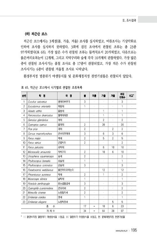 Ⅱ. 조사결과 www.nie.re.kr ? 195 라 적근산 코스 적근산 코스에서는 3계절 봄, 가을, 겨울 조사를 실시하였고, 여름조사는 기상악화로 인하여 조사를 실시하지 못하였다. 3회에 걸친 조사에서 관찰된 조류는 총 23종 97개체였다 표 65 가장 많은 수가 관찰된 조류는 물까치로서 20개체였고, 다음으로는 붉은머리오목눈이 12개체, 그리고 직박구리와 숲새 각각 10개체씩 관찰하였다. 가장 많은 종이 관찰된 조사시기는 봄철 조사로 총 17종이 관찰되었고, 가장 적은 수가 관찰된 조사시기는 6종이 관찰된 겨울철 조사로 나타났다. 환경부지정 멸종위기 야생동식물 및 문화재청지정 천연기념물은 관찰되지 않았다. 순번 학 명 국 명 봄 여름 가을 겨울 최대 개체수 비고° 1 Cuculus saturatus 벙...