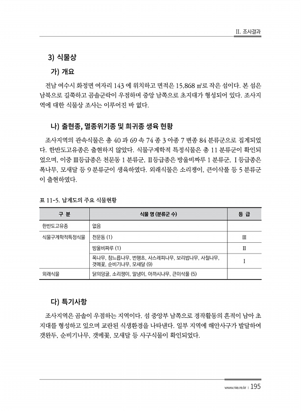 II. 조사결과 www.nie.re.kr ?195 3 전남 여수시 화정면 여자리 143 에 위치하고 면적은 15,868 ㎡로 작은 섬이다. 본 섬은 남북으로 길쭉하고 곰솔군락이 우점하며 중앙 남쪽으로 초지대가 형성되어 있다. 조사지 역에 대한 식물상 조사는 이루어진 바 없다. , 조사지역의 관속식물은 총 40 과 69 속 74 종 3 아종 7 변종 84 분류군으로 집계되었 다. 한반도고유종은 출현하지 않았다. 식물구계학적 특정식물은 총 11 분류군이 확인되 었으며, 이중 Ⅲ등급종은 천문동 1 분류군, Ⅱ등급종은 방울비짜루 1 분류군, Ⅰ등급종은 폭나무, 모새달 등 9 분류군이 생육하였다. 외래식물은 소리쟁이, 큰이삭풀 등 5 분류군 이 출현하였다. 구 분 식물 명 분류군 수 등 급 한반도고유종 없음 식물구계...