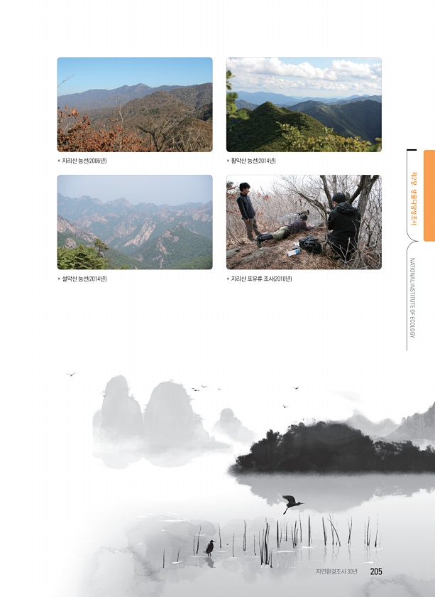 ? 지리산 능선 2006년 ? 황악산 능선 2014년 ? 설악산 능선 2014년 ? 지리산 포유류 조사 2010년 제2장. 생물다양성조사 NATIONAL INSTITUTE OF ECOLOGY 자연환경조사 30년205