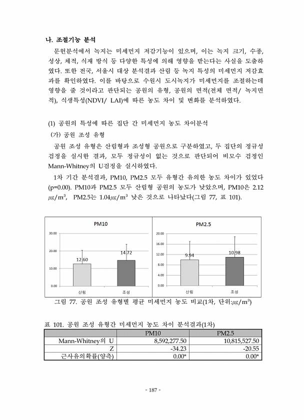 187 나 조절기능 분석 문헌분석에서 녹지는 미세먼지 저감기능이 있으며 이는 녹지 크기 수종 성상 체적 식재 방식 등 다양한 특성에 의해 영향을 받는다는 사실을 도출하 였다 또한 전국 서울시 대상 분석결과 산림 등 녹지 특성의 미세먼지 저감효 과를 확인하였다 이를 바탕으로 수원시 도시녹지가 미세먼지를 조절하는데 영향을 줄 것이라고 판단되는 공원의 유형 공원의 면적 전체 면적 녹지면 적 식생특성 에 따른 농도 차이 및 변화를 분석하였다 공원의 특성에 따른 집단 간 미세먼지 농도 차이분석 가 공원 조성 유형 공원 조성 유형은 산림형과 조성형 공원으로 구분하였고 두 집단의 정규성 검정을 실시한 결과 모두 정규성이 없는 것으로 판단되어 비모수 검정인 의 검정을 실시하였다 차 기간 분석결과 모두 유형간 유의한 농도 ...