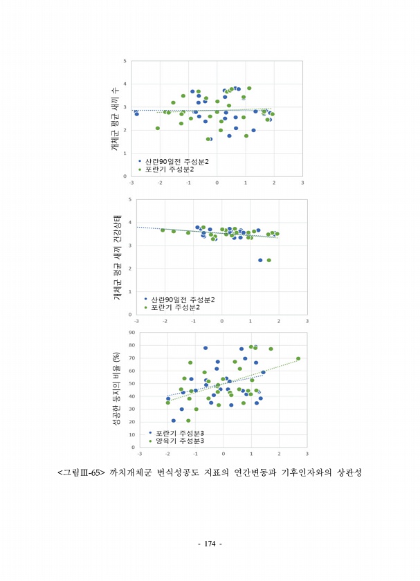 174 그림Ⅲ-65 까치개체군 번식성공도 지표의 연간변동과 기후인자와의상관성