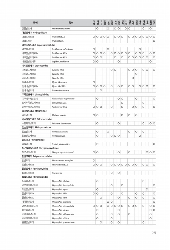 203 큰줄날도래 Macronema radiatum ○ ○ ○ ○ ○ ○ ○ ○ 애날도래과 Hydroptilidae 애날도래 KUa Hydroptila KUa ○ ○ ○ ○ ○ ○ ○ ○ ○ ○ ○ ○ ○ ○ ○ ○ 애날도래류 Hydroptila sp. ○ 네모집날도래과 Lepidostomatidae 네모집날도래 Lepidostoma albardanum ○ ○ ○ 네모집날도래 KUa Lepidostoma KUa ○ ○ ○ ○ ○ ○ ○ ○ ○ ○ ○ ○ ○ ○ ○ 네모집날도래 KUb Lepidostoma KUb ○ ○ ○ ○ ○ ○ ○ ○ ○ ○ ○ ○ 네모집날도래류 Lepidostomatidae sp. ○ ○ ○ ○ 나비날도래과 Leptoceridae 나비날도래 KUa Ceraclea KUa ○ ○ ○ ○...
