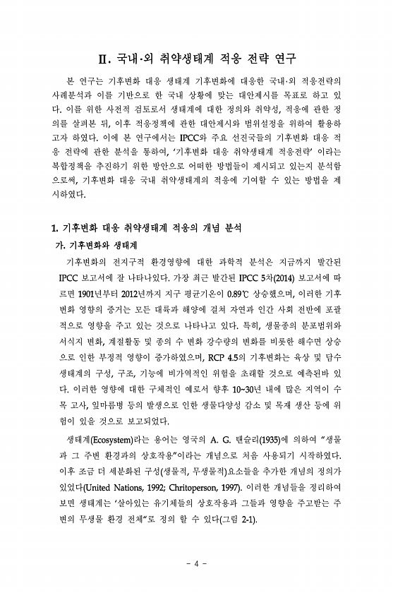 4 국내 외 취약생태계 적응 전략 연구 본 연구는 기후변화 대응 생태계 기후변화에 대응한 국내 외 적응전략의 사례분석과 이를 기반으로 한 국내 상황에 맞는 대안제시를 목표로 하고 있 다 이를 위한 사전적 검토로서 생태계에 대한 정의와 취약성 적응에 관한 정 의를 살펴본 뒤 이후 적응정책에 관한 대안제시와 범위설정을 위하여 활용하 고자 하였다 이에 본 연구에서는 와 주요 선진국들의 기후변화 대응 적 응 전략에 관한 분석을 통하여 기후변화 대응 취약생태계 적응전략 이라는 복합정책을 추진하기 위한 방안으로 어떠한 방법들이 제시되고 있는지 분석함 으로써 기후변화 대응 국내 취약생태계의 적응에 기여할 수 있는 방법을 제 시하였다 기후변화 대응 취약생태계 적응의 개념 분석 가 기후변화와 생태계 기후변화의 전지구적 환경...