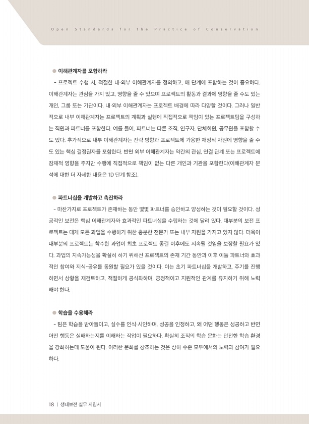 18 | 생태보전 실무 지침서 O p e n S t a n d a r d s f o r t h e P r a c t i c e o f C o n s e r v a t i o n ● 이해관계자를 포함하라 프로젝트 수행 시, 적절한 내·외부 이해관계자를 정의하고, 매 단계에 포함하는 것이 중요하다. 이해관계자는 관심을 가지 있고, 영향을 줄 수 있으며 프로젝트의 활동과 결과에 영향을 줄 수도 있는 개인, 그룹 또는 기관이다. 내·외부 이해관계자는 프로젝트 배경에 따라 다양할 것이다. 그러나 일반 적으로 내부 이해관계자는 프로젝트의 계획과 실행에 직접적으로 책임이 있는 프로젝트팀을 구성하 는 직원과 파트너를 포함한다. 예를 들어, 파트너는 다른 조직, 연구자, 단체회원, 공무원을 포함할 수 도 있다. 추가적으로 ...