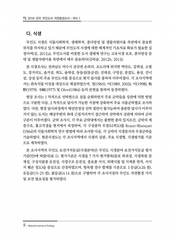 2018 전국 무인도서 자연환경조사 여수 1 8 ? National Institute of Ecology 무인도 식생은 식물사회학적, 생태학적, 종다양성 및 생물자원이용 측면에서 중요한 위치를 차지하고 있기 때문에 무인도의 식생에 대한 체계적인 기초자료 확보가 필요한 실 정이며 김, 2012a , 무인도서를 비롯한 도서 생태계 연구는 고유식생 보호, 종다양성 증 대 및 생물자원이용 측면에서 매우 중요하다 김하송, 2012b, 2013 본 식생조사는 전라남도 여수시 삼산면 손죽리, 초도리에 위치한 역만도, 갈퀴섬, 소평 도, 장거리도, 솔거섬, 취도, 술대섬, 둥들섬 둥글섬 , 진대섬, 구멍섬, 중결도, 용섬, 건너 섬, 상섬 등의 주요 무인도서를 중심으로 현지 답사를 통하여 이루어졌다. 각 조사지역에 서는 ...