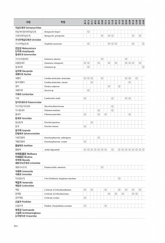 204 각날도래과 Stenopsychidae 연날개수염치레각날도래 Stenopsyche bergeri ○ 수염치레각날도래 Stenopsyche griseipennis ○ ○ ○ ○ ○ 가시우묵날도래과 Uenoidae 가시우묵날도래 Neophylax ussuriensis ○ ○ ○ ○ ○ ○ 연갑강 Malacostraca 단각목 Amphipoda 옆새우과 Gammaridae 가시다리옆새우 Gammarus odaensis ○ ○ 보통옆새우 Gammarus sobaegensis ○ ○ ○ ○ ○ ○ ○ ○ ○ 옆새우류 Gammarus sp. ○ ○ 십각목 Decapoda 새뱅이과 Atyidae 새뱅이 Caridina denticulata denticulata ○ ○ ○ ○ ○ ○ ○ 중국새뱅이 Caridina d...