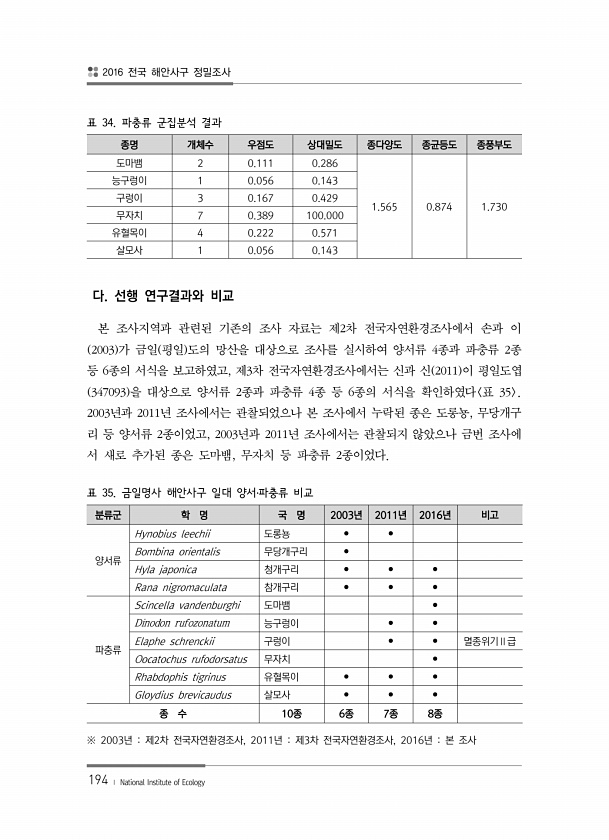2016 전국 해안사구 정밀조사 194 ? National Institute of Ecology 표 34. 파충류 군집분석 결과 종명 개체수 우점도 상대밀도 종다양도 종균등도 종풍부도 도마뱀 2 0.111 0.286 1.565 0.874 1.730 능구렁이 1 0.056 0.143 구렁이 3 0.167 0.429 무자치 7 0.389 100.000 유혈목이 4 0.222 0.571 살모사 1 0.056 0.143 다. 선행 연구결과와 비교 본 조사지역과 관련된 기존의 조사 자료는 제2차 전국자연환경조사에서 손과 이 2003 가 금일 평일 도의 망산을 대상으로 조사를 실시하여 양서류 4종과 파충류 2종 등 6종의 서식을 보고하였고, 제3차 전국자연환경조사에서는 신과 신 2011 이 평일도엽 347093 을 대...