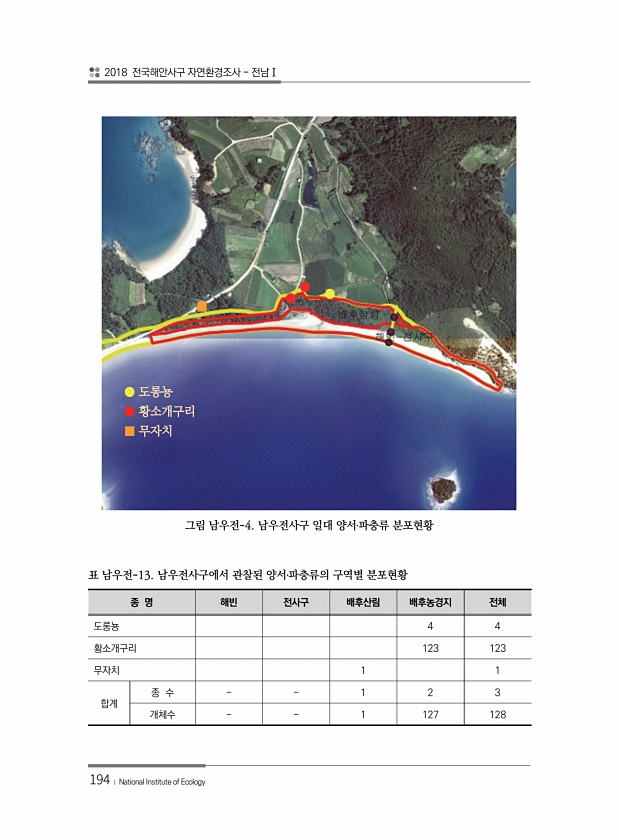 2018 전국해안사구 자연환경조사 전남Ⅰ 194 ? National Institute of Ecology ● 도롱뇽 ● 황소개구리 ■ 무자치 ● ● ■ ● 그림 남우전-4. 남우전사구 일대 양서?파충류 분포현황 종 명 해빈 전사구 배후산림 배후농경지 전체 도롱뇽 4 4 황소개구리 123 123 무자치 1 1 합계 종 수 1 2 3 개체수 1 127 128 표 남우전-13. 남우전사구에서 관찰된 양서?파충류의 구역별분포현황