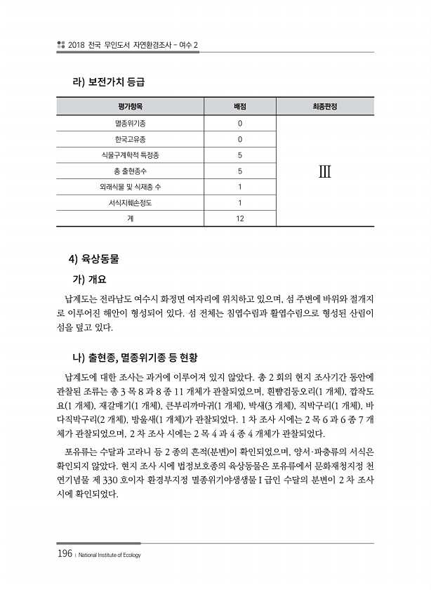 2018 전국 무인도서 자연환경조사 여수 2 196 ? National Institute of Ecology 평가항목 배점 최종판정 멸종위기종 0 Ⅲ 한국고유종 0 식물구계학적 특정종 5 총 출현종수 5 외래식물 및 식재종 수 1 서식지훼손정도 1 계 12 4 납계도는 전라남도 여수시 화정면 여자리에 위치하고 있으며, 섬 주변에 바위와 절개지 로 이루어진 해안이 형성되어 있다. 섬 전체는 침엽수림과 활엽수림으로 형성된 산림이 섬을 덮고 있다. , 납계도에 대한 조사는 과거에 이루어져 있지 않았다. 총 2 회의 현지 조사기간 동안에 관찰된 조류는 총 3 목 8 과 8 종 11 개체가 관찰되었으며, 흰뺨검둥오리 1 개체 , 깝작도 요 1 개체 , 재갈매기 1 개체 , 큰부리까마귀 1 개체 , 박새 3 개체 , ...