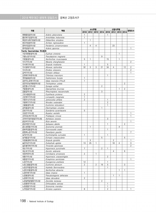 2018 백두대간 생태계 정밀조사 응복산 고정조사구 198 ? National Institute of Ecology 국명 학명 소나무림 신갈나무림 문헌조사 2018 2012 2013 2014 2018 2012 2013 2014 평행줄잎말이나방 Acleris platynotana 1 1 홀로애기잎말이나방 Antichlidas holocnista 1 흑점무늬애기잎말이나방 Gibberifera simplana 1 흰꼬리잎말이나방 Archips nigricaudana 1 흰머리잎말이나방 Pandemis cinnamomeana 4 4 23 흰색잎말이나방 Acleris japonica 1 Family Geometridae 자나방과 가운데흰물결자나방 Euphyia cineraria 1 가을노랑가지나방 Pseudepion...