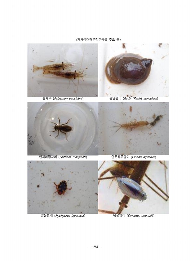 194 저서성대형무척추동물 주요 종 줄새우 Palaemon paucidens 물달팽이 Radix Radix auricularia 언저리잠자리 Epitheca marginata 연못하루살이 Cloeon dipterum 알물방개 Hyphydrus japonicus 왕물맴이 Dineutes orientalis