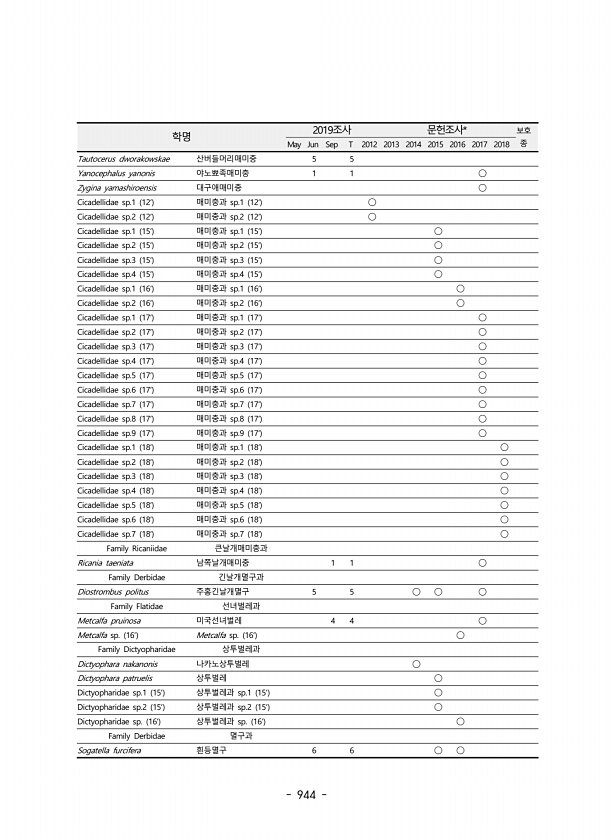 944 학명 2019조사 문헌조사* 보호 May Jun Sep T 2012 2013 2014 2015 2016 2017 2018 종 Tautocerus dworakowskae 산버들머리매미충 5 5 Yanocephalus yanonis 야노뾰족매미충 1 1 ? Zygina yamashiroensis 대구애매미충 ? Cicadellidae sp.1 12‘ 매미충과 sp.1 12‘ ? Cicadellidae sp.2 12‘ 매미충과 sp.2 12‘ ? Cicadellidae sp.1 15‘ 매미충과 sp.1 15‘ ? Cicadellidae sp.2 15‘ 매미충과 sp.2 15‘ ? Cicadellidae sp.3 15‘ 매미충과 sp.3 15‘ ? Cicadellidae sp.4 15‘ 매미충과 sp.4 1...