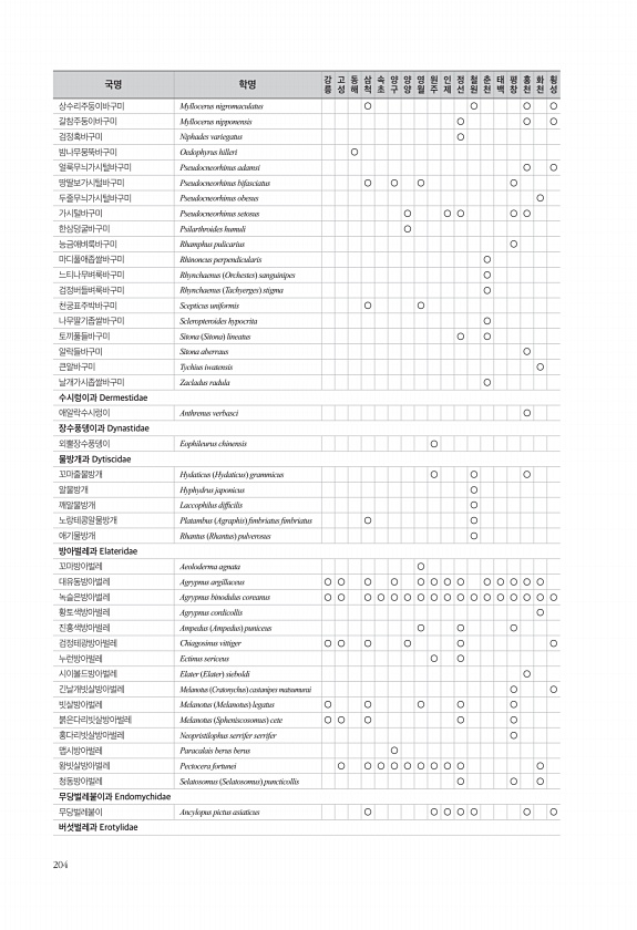 204 상수리주둥이바구미 Myllocerus nigromaculatus ○ ○ ○ ○ 갈참주둥이바구미 Myllocerus nipponensis ○ ○ ○ 검정혹바구미 Niphades variegatus ○ 밤나무뭉뚝바구미 Oedophyrus hilleri ○ 얼룩무늬가시털바구미 Pseudocneorhinus adamsi ○ ○ 땅딸보가시털바구미 Pseudocneorhinus bifasciatus ○ ○ ○ ○ 두줄무늬가시털바구미 Pseudocneorhinus obesus ○ 가시털바구미 Pseudocneorhinus setosus ○ ○ ○ ○ ○ 한삼덩굴바구미 Psilarthroides humuli ○ 능금애벼룩바구미 Rhamphus pulicarius ○ 마디풀애좁쌀바구미 Rhinoncus perpend...