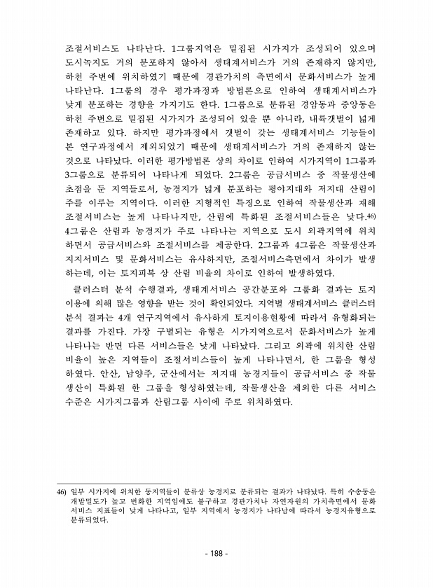 조절서비스도 나타난다. 1그룹지역은 밀집된 시가지가 조성되어 있으며 도시녹지도 거의 분포하지 않아서 생태계서비스가 거의 존재하지 않지만, 하천 주변에 위치하였기 때문에 경관가치의 측면에서 문화서비스가 높게 나타난다. 1그룹의 경우 평가과정과 방법론으로 인하여 생태계서비스가 낮게 분포하는 경향을 가지기도 한다. 1그룹으로 분류된 경암동과 중앙동은 하천 주변으로 밀집된 시가지가 조성되어 있을 뿐 아니라, 내륙갯벌이 넓게 존재하고 있다. 하지만 평가과정에서 갯벌이 갖는 생태계서비스 기능들이 본 연구과정에서 제외되었기 때문에 생태계서비스가 거의 존재하지 않는 것으로 나타났다. 이러한 평가방법론 상의 차이로 인하여 시가지역이 1그룹과 3그룹으로 분류되어 나타나게 되었다. 2그룹은 공급서비스 중 작물생산에 초점을 둔 ...
