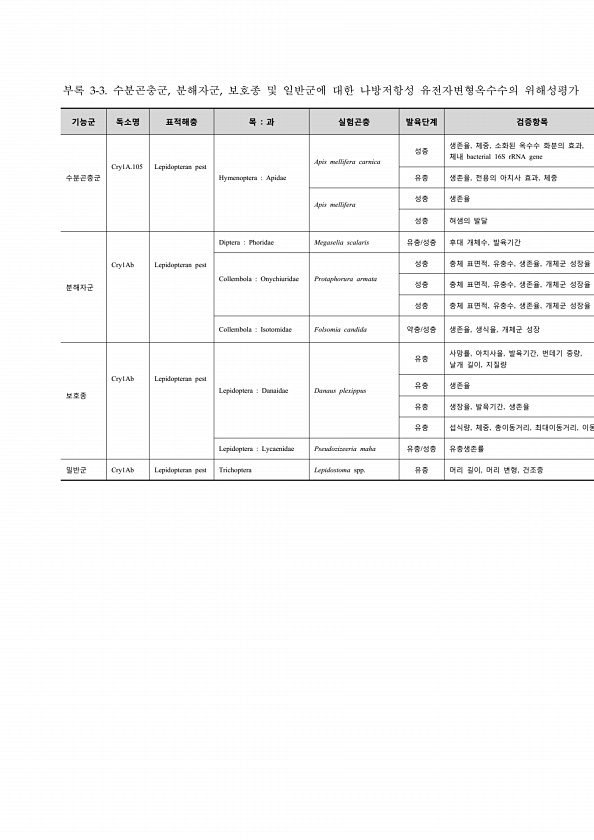 기능군 독소명 표적해충 목 과 실험곤충 발육단계 검증항목 수분곤충군 Cry1A.105 Lepidopteran pest Hymenoptera Apidae Apis mellifera carnica 성충 생존율, 체중, 소화된 옥수수 화분의 효과, 체내 bacterial 16S rRNA gene 유충 생존율, 전용의 아치사 효과, 체중 Apis mellifera 성충 생존율 성충 혀샘의 발달 분해자군 Cry1Ab Lepidopteran pest Diptera Phoridae Megaselia scalaris 유충/성충 후대 개체수, 발육기간 Collembola Onychiuridae Protaphorura armata 성충 충체 표면적, 유충수, 생존율, 개체군 성장율 성충 충체 표면적, 유충수, 생존율, 개체군...