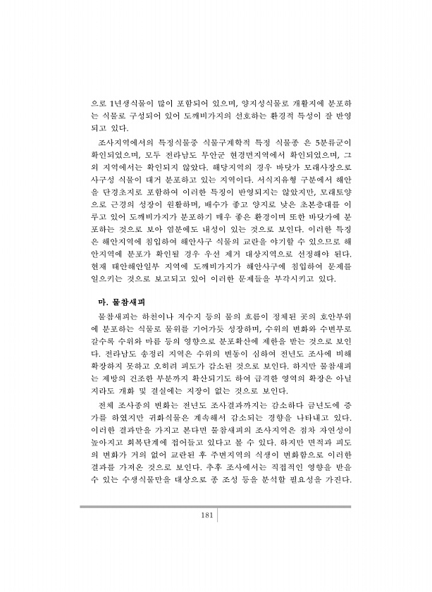 181 으로 1년생식물이 많이 포함되어 있으며, 양지성식물로 개활지에 분포하 는 식물로 구성되어 있어 도깨비가지의 선호하는 환경적 특성이 잘 반영 되고 있다. 조사지역에서의 특정식물중 식물구계학적 특정 식물종 은 5분류군이 확인되었으며, 모두 전라남도 무안군 현경면지역에서 확인되었으며, 그 외 지역에서는 확인되지 않았다. 해당지역의 경우 바닷가 모래사장으로 사구성 식물이 대거 분포하고 있는 지역이다. 서식지유형 구분에서 해안 을 단경초지로 포함하여 이러한 특징이 반영되지는 않았지만, 모래토양 으로 근경의 성장이 원활하며, 배수가 좋고 양지로 낮은 초본층대를 이 루고 있어 도깨비가지가 분포하기 매우 좋은 환경이며 또한 바닷가에 분 포하는 것으로 보아 염분에도 내성이 있는 것으로 보인다. 이러한 특징 은 해안지...