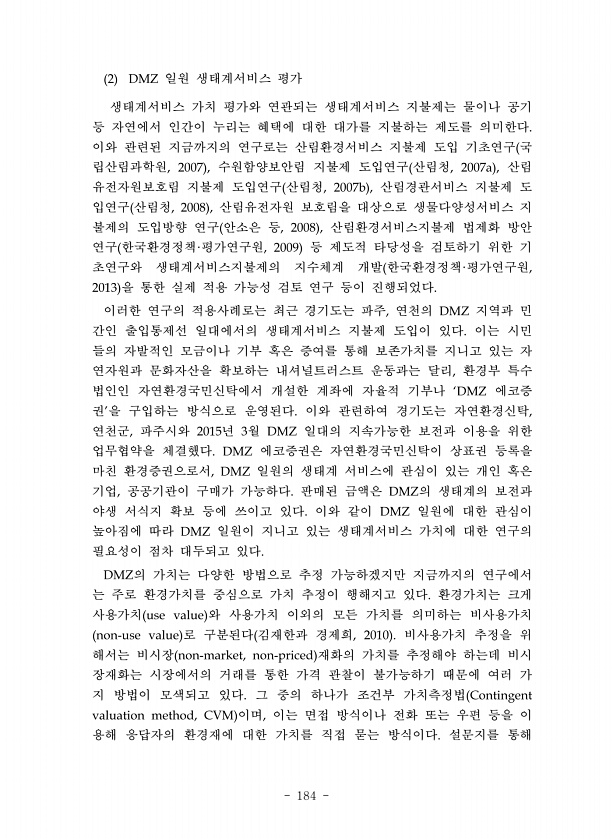 184 일원 생태계서비스 평가 생태계서비스 가치 평가와 연관되는 생태계서비스 지불제는 물이나 공기 등 자연에서 인간이 누리는 혜택에 대한 대가를 지불하는 제도를 의미한다 이와 관련된 지금까지의 연구로는 산림환경서비스 지불제 도입 기초연구 국 립산림과학원 수원함양보안림 지불제 도입연구 산림청 산림 유전자원보호림 지불제 도입연구 산림청 산림경관서비스 지불제 도 입연구 산림청 산림유전자원 보호림을 대상으로 생물다양성서비스 지 불제의 도입방향 연구 안소은 등 산림환경서비스지불제 법제화 방안 연구 한국환경정책 평가연구원 등 제도적 타당성을 검토하기 위한 기 초연구와 생태계서비스지불제의 지수체계 개발 한국환경정책 평가연구원 을 통한 실제 적용 가능성 검토 연구 등이 진행되었다 이러한 연구의 적용사례로는 최근 경기도는 ...