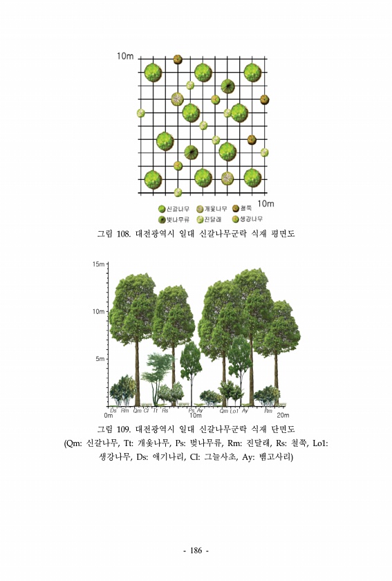 그림 108. 대전광역시 일대 신갈나무군락 식재 평면도 그림 109. 대전광역시 일대 신갈나무군락 식재 단면도 Qm신갈나무, Tt개옻나무, Ps벚나무류, Rm진달래, Rs철쭉, Lo1생강나무, Ds애기나리, Cl그늘사초, Ay뱀고사리 186