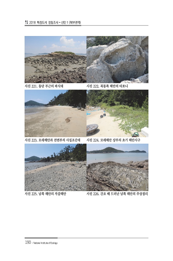 2018 특정도서 정밀조사 신안 1 북부권역 190 ? National Institute of Ecology 사진 221. 동단 부근의 파식대 사진 222. 북동쪽 해안의 타포니 사진 223. 모래해안과 전면부의 사질조간대 사진 224. 모래해안 상부의 초기 해안사구 사진 225. 남쪽 해안의 자갈해안 사진 226. 간조 때 드러난 남쪽 해안의주상절리