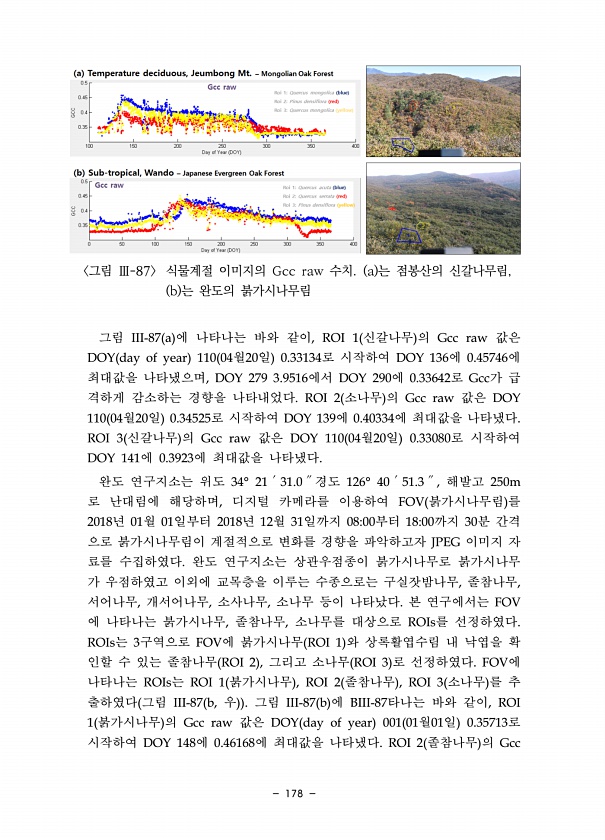 178 그림 Ⅲ-87 식물계절 이미지의 Gcc raw 수치. a 는 점봉산의 신갈나무림, b 는 완도의 붉가시나무림 그림 III-87 a 에 나타나는 바와 같이, ROI 1 신갈나무 의 Gcc raw 값은 DOY day of year 110 04월20일 0.33134로 시작하여 DOY 136에 0.45746에 최대값을 나타냈으며, DOY 279 3.9516에서 DOY 290에 0.33642로 Gcc가 급 격하게 감소하는 경향을 나타내었다. ROI 2 소나무 의 Gcc raw 값은 DOY 110 04월20일 0.34525로 시작하여 DOY 139에 0.40334에 최대값을 나타냈다. ROI 3 신갈나무 의 Gcc raw 값은 DOY 110 04월20일 0.33080로 시작하여 DOY 141에 0.3923에 최...