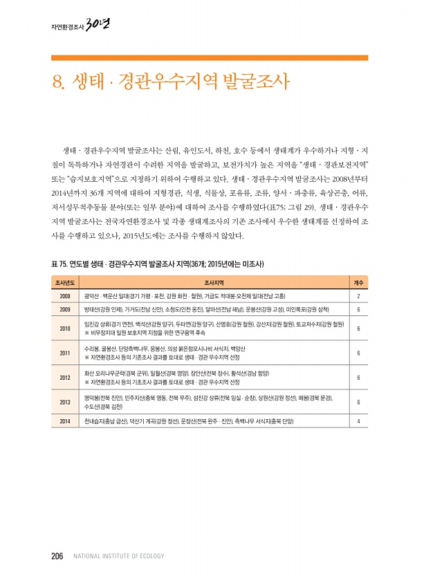 생태 · 경관우수지역 발굴조사는 산림, 유인도서, 하천, 호수 등에서 생태계가 우수하거나 지형 · 지 질이 독특하거나 자연경관이 수려한 지역을 발굴하고, 보전가치가 높은 지역을 “생태 · 경관보전지역” 또는 “습지보호지역”으로 지정하기 위하여 수행하고 있다. 생태 · 경관우수지역 발굴조사는 2008년부터 2014년까지 36개 지역에 대하여 지형경관, 식생, 식물상, 포유류, 조류, 양서 · 파충류, 육상곤충, 어류, 저서성무척추동물 분야 또는 일부 분야 에 대하여 조사를 수행하였다 표75; 그림 29 생태 · 경관우수 지역 발굴조사는 전국자연환경조사 및 각종 생태계조사의 기존 조사에서 우수한 생태계를 선정하여 조 사를 수행하고 있으나, 2015년도에는 조사를 수행하지 않았다. 표 75. 연도별 생태 · 경관...