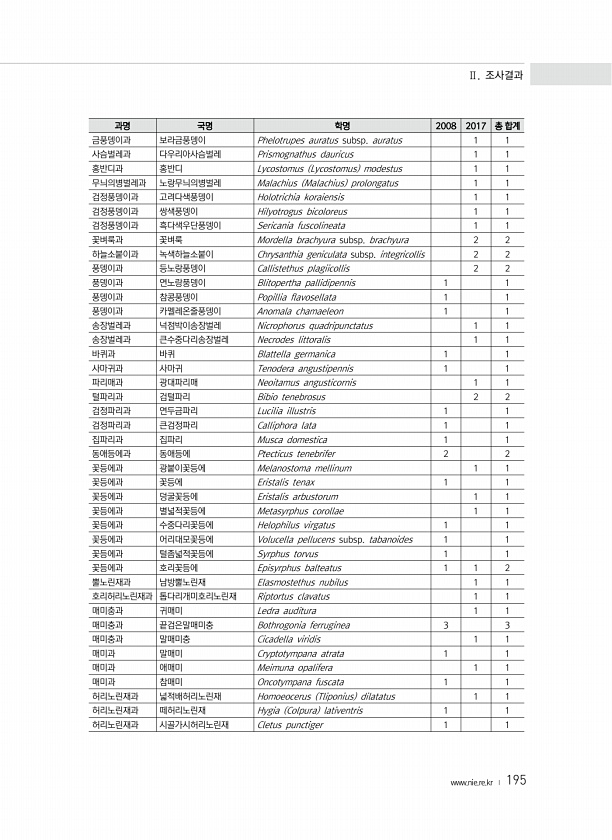 Ⅱ. 조사결과 www.nie.re.kr ? 195 과명 국명 학명 2008 2017 총 합계 금풍뎅이과 보라금풍뎅이 Phelotrupes auratus subsp. auratus 1 1 사슴벌레과 다우리아사슴벌레 Prismognathus dauricus 1 1 홍반디과 홍반디 Lycostomus Lycostomus modestus 1 1 무늬의병벌레과 노랑무늬의병벌레 Malachius Malachius prolongatus 1 1 검정풍뎅이과 고려다색풍뎅이 Holotrichia koraiensis 1 1 검정풍뎅이과 쌍색풍뎅이 Hilyotrogus bicoloreus 1 1 검정풍뎅이과 흑다색우단풍뎅이 Sericania fuscolineata 1 1 꽃벼룩과 꽃벼룩 Mordella brachyura subs...