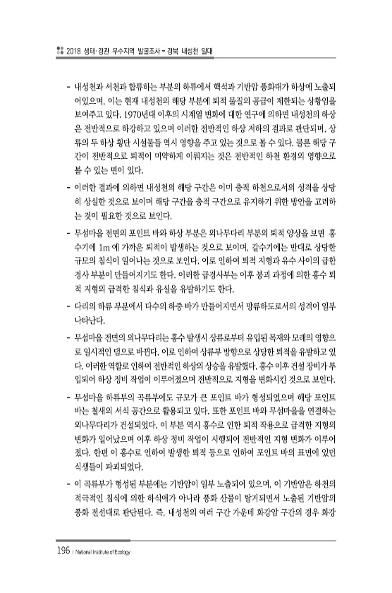 2018 생태·경관 우수지역 발굴조사 경북 내성천 일대 196 ? National Institute of Ecology 내성천과 서천과 합류하는 부분의 하류에서 핵석과 기반암 풍화대가 하상에 노출되 어있으며, 이는 현재 내성천의 해당 부분에 퇴적 물질의 공급이 제한되는 상황임을 보여주고 있다. 1970년대 이후의 시계열 변화에 대한 연구에 의하면 내성천의 하상 은 전반적으로 하강하고 있으며 이러한 전반적인 하상 저하의 결과로 판단되며, 상 류의 두 하상 횡단 시설물들 역시 영향을 주고 있는 것으로 볼 수 있다. 물론 해당 구 간이 전반적으로 퇴적이 미약하게 이뤄지는 것은 전반적인 하천 환경의 영향으로 볼 수 있는 면이 있다. 이러한 결과에 의하면 내성천의 해당 구간은 이미 충적 하천으로서의 성격을 상당 히 ...