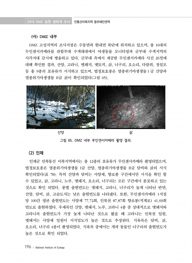 2015 DMZ 일원 생태계 조사 민통선이북지역 동부해안권역 196 ? National Institute of Ecology 마 DMZ 내부 DMZ 고성지역의 조사지점은 수동면과 현내면 북단에 위치하고 있으며, 총 16대의 무인센서카메라를 관할부대 수색대대에서 야생동물 모니터링과 군부대 수색지역의 사각지대 감시에 병용하고 있다. 군부대 측에서 제공한 무인센서카메라 사진 26컷에 대해 확인한 결과, 산양, 고라니, 멧돼지, 멧토끼, 삵, 너구리, 오소리, 다람쥐, 청설모 등 총 9종의 포유류가 서식하고 있으며, 법정보호종은 멸종위기야생생물Ⅰ급 산양과 멸종위기야생생물 II급 삵이 확인되었다 그림 65 산양 삵 그림 65. DMZ 내부 무인센서카메라 촬영 결과. 2 인제 인제군 민북통선 이북지역에서는 총 12종의...