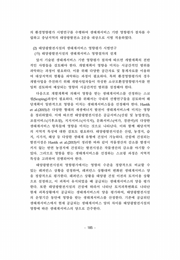 185 의 환경영향평가 시범연구를 수행하여 생태계서비스 기반 영향평가 절차를 수 립하고 충남지역의 태양광발전소 2곳을 대상으로 시범 적용하였다. 2 태양광발전시설의 생태계서비스 영향평가 시범연구 가 태양광발전시설의 생태계서비스 영향절차의 설계 앞서 기술된 생태계서비스 기반 영향평가 절차에 따르면 개발계획의 전반 적인 사항들을 검토해야 한다. 개발계획이 영향을 미치는 시공간적인 범위를 파악하는 과정이 필요하다. 이를 위해 다양한 공간자료 및 통계자료를 이용하 여 대상지역의 현황을 파악하는 과정이 필요하다. 특히 환경영향평가의 경우 개발사업을 추진하기 위해 개발사업자들이 작성한 소규모환경영향평가서를 면 밀히 검토하여 예상되는 영향의 시공간적인 범위를 설정해야 한다. 다음으로 개발계획에 의해서 영향을 받는 생태계...